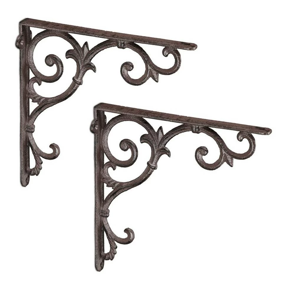 2er Set Regal Wandhalterung mit Ornamenten Mit den Wandwinkeln zaubern Sie aus langweiligen Regalbrettern im Handumdrehen dekorative Wandregale. Die Verzierungen im barocken Stil lassen die Regalstützen zum echten Blickfang werden und versprühen nostalgischen Charme. Komplett aus Gusseisen gefertigt, sind die Wandregalhalterungen besonders stabil und halten Regalböden sicher. Mithilfe vorbereiteter Bohrlöcher können die Regalhalterungen schnell montiert werden.
