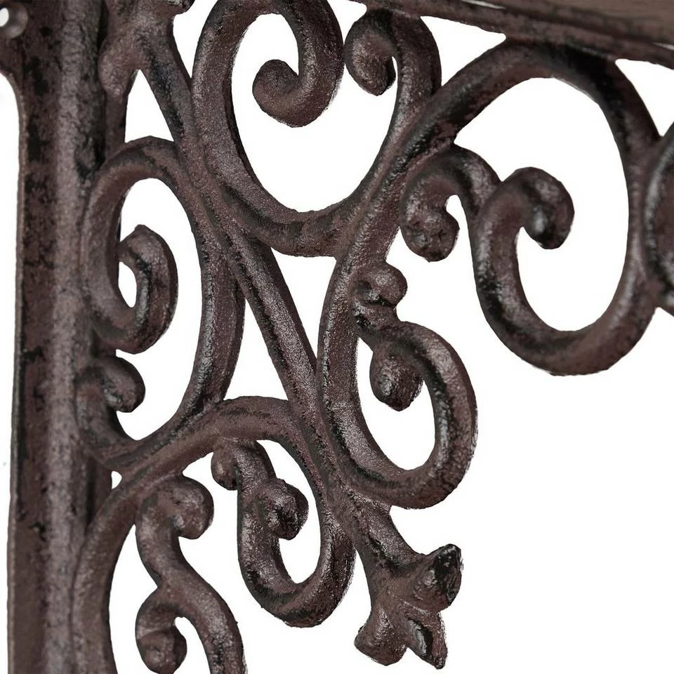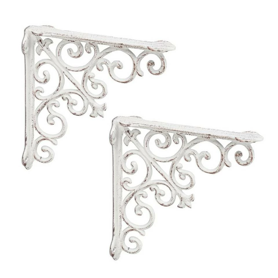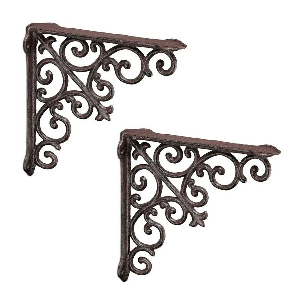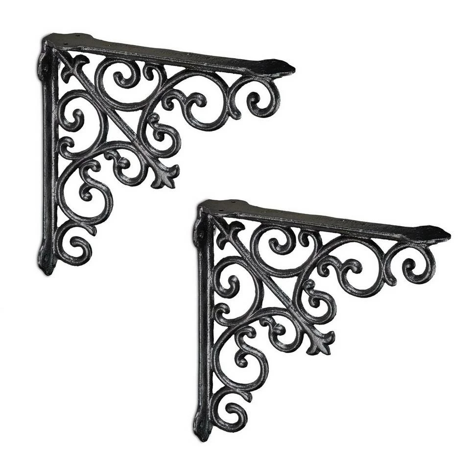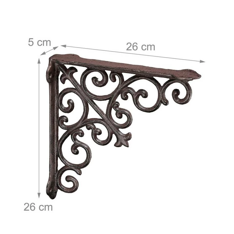 Regal Winkelträger im angesagten Vintage-Stil Die antiken Regalträger im 2er Set sind nicht nur eine Auflage für Regalbretter, sondern zugleich ein dekoratives Highlight. Mit ihnen wird jeder Regalboden zum ausgefallenen Blickfang. Geschwungene Ornamente im Barock-Stil verbinden beide Streben der Stegkonsolen und versprühen nostalgischen Charme. Gefertigt aus massivem Gusseisen können die rustikalen Winkel Wandhalterungen auch im geschützten Außenbereich zum Einsatz kommen und Balkon oder Gartenhütte schmücken.