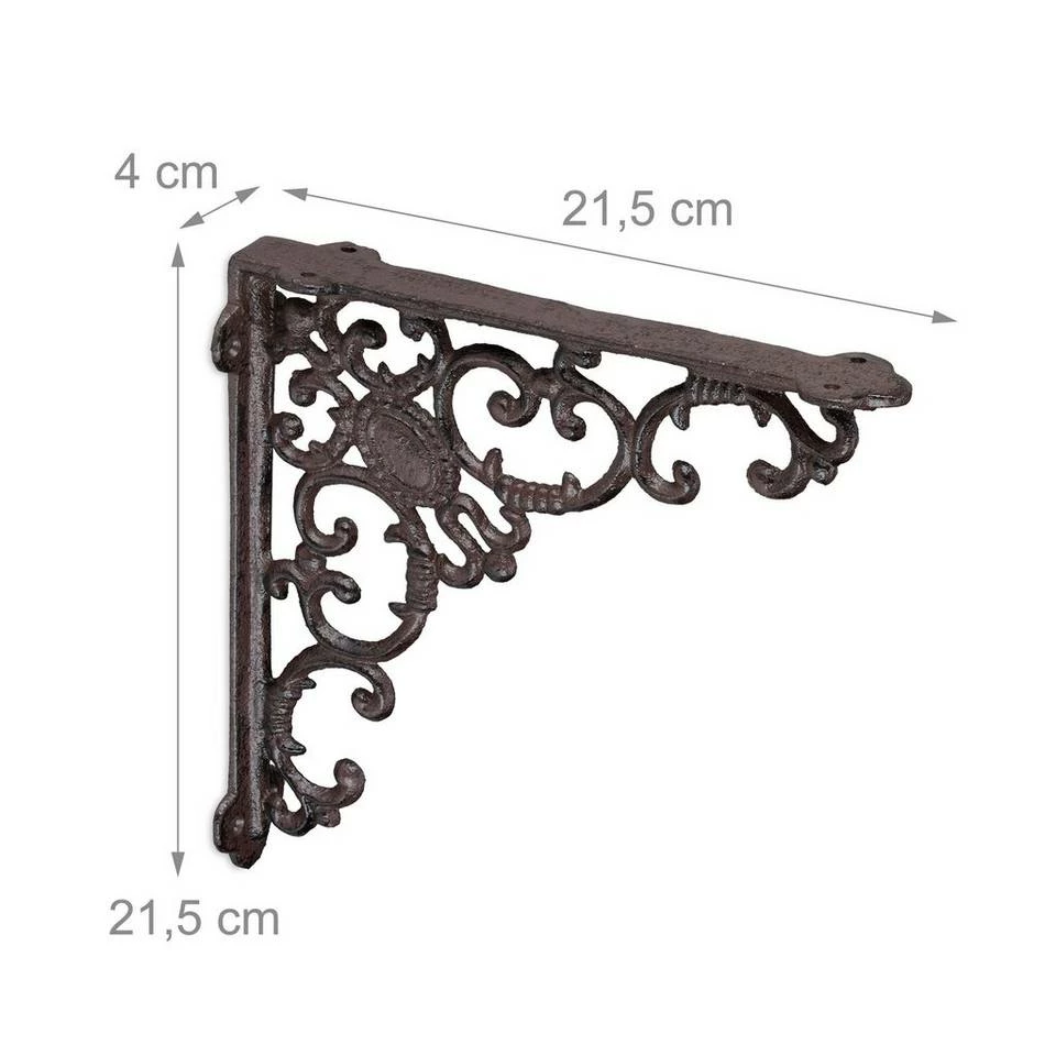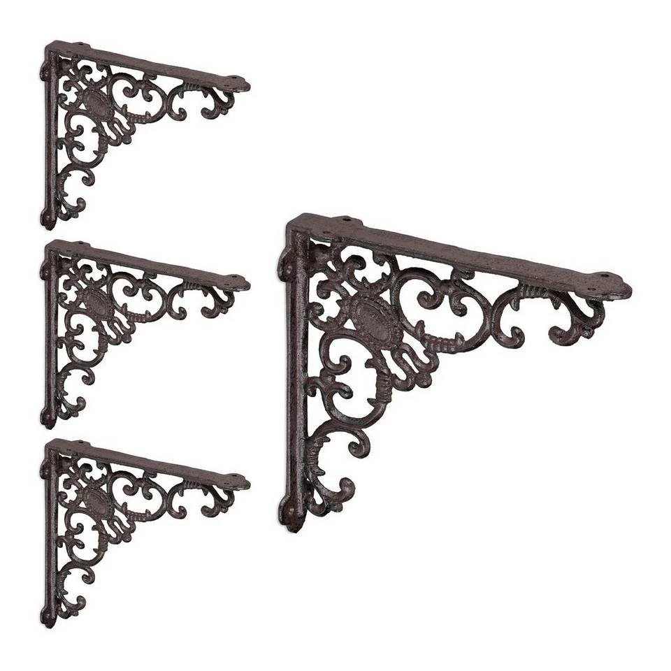 Winkelkonsole für unterschiedliche Regalbretter Die Regal Winkelträger im 4er Set sind praktisch und dekorativ zugleich. Mit einem beliebigen Regalbrett verwandeln Sie die Regalträger in ein einzigartiges und individuelles Wandregal. Gleichzeitig bringen Sie mit der Regalkonsole ganz besonderen Charme in Ihre vier Wände. Setzten Sie antike Akzente im Vintage-Look und nutzen Sie die barocken Ornamente als dekoratives Highlight. Ebenso lassen sich mit den Regalhalterungen auf dem Balkon oder an der Gartenhütte rustikale Akzente setzen.