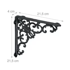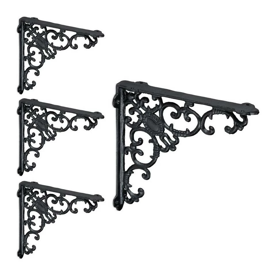 Winkelkonsole für unterschiedliche Regalbretter Die Regal Winkelträger im 4er Set sind praktisch und dekorativ zugleich. Mit einem beliebigen Regalbrett verwandeln Sie die Regalträger in ein einzigartiges und individuelles Wandregal. Gleichzeitig bringen Sie mit der Regalkonsole ganz besonderen Charme in Ihre vier Wände. Setzten Sie antike Akzente im Vintage-Look und nutzen Sie die barocken Ornamente als dekoratives Highlight. Ebenso lassen sich mit den Regalhalterungen auf dem Balkon oder an der Gartenhütte rustikale Akzente setzen.