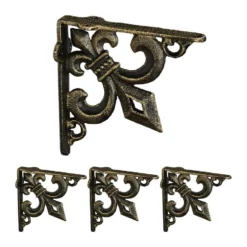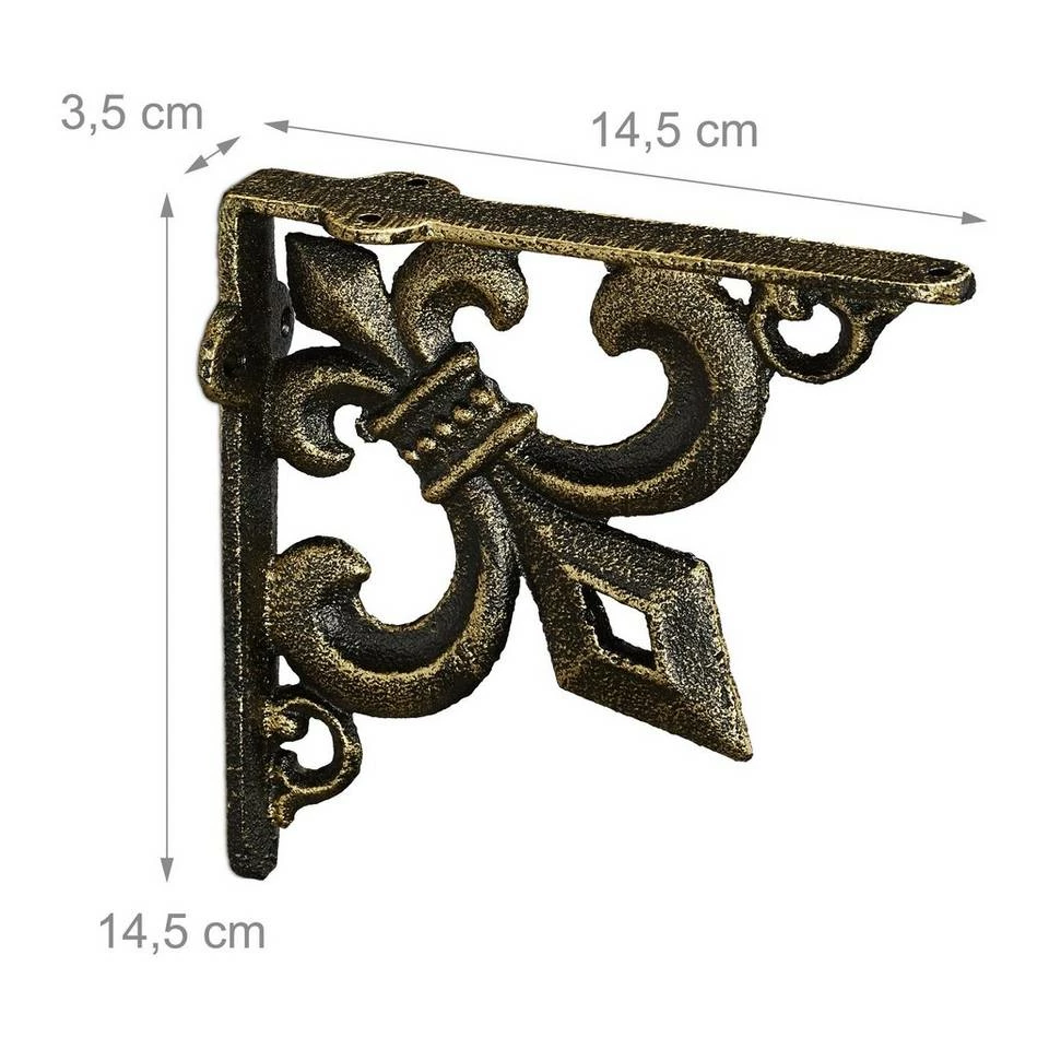 Winkel-Regalträger im antiken Stil Mit diesen Winkelhaltern im 4er Set zaubern Sie aus schlichten Regalbrettern im Handumdrehen dekorative Wandregale mit Vintage Charme, auf denen Sie Bücher und vieles mehr gekonnt in Szene setzen können. Vor allem in nostalgisch angehauchten Einrichtungsstilen fügen sich die Regalhalter perfekt ein und setzen optische Akzente an jeder Wand. Die Regalträger beeindrucken mit Ihrem großen Lilien Ornament im antiken Stil, das durch das robuste Gusseisen besonders gut zur Geltung kommt.