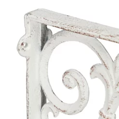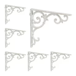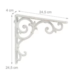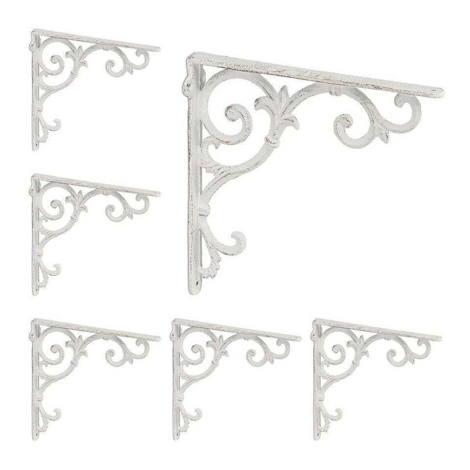 6er Set Regal Wandhalterung mit Ornamenten Mit den Wandwinkeln zaubern Sie aus langweiligen Regalbrettern im Handumdrehen dekorative Wandregale. Die Verzierungen im barocken Stil lassen die Regalstützen zum echten Blickfang werden und versprühen nostalgischen Charme. Komplett aus Gusseisen gefertigt, sind die Wandregalhalterungen besonders stabil und halten Regalböden sicher. Mithilfe vorbereiteter Bohrlöcher können die Regalhalterungen schnell montiert werden.