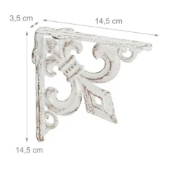 Winkel-Regalträger im antiken Stil Mit diesen Winkelhaltern im 6er Set zaubern Sie aus schlichten Regalbrettern im Handumdrehen dekorative Wandregale mit Vintage Charme, auf denen Sie Bücher und vieles mehr gekonnt in Szene setzen können. Vor allem in nostalgisch angehauchten Einrichtungsstilen fügen sich die Regalhalter perfekt ein und setzen optische Akzente an jeder Wand. Die Regalträger beeindrucken mit Ihrem großen Lilien Ornament im antiken Stil, das durch das robuste Gusseisen besonders gut zur Geltung kommt.