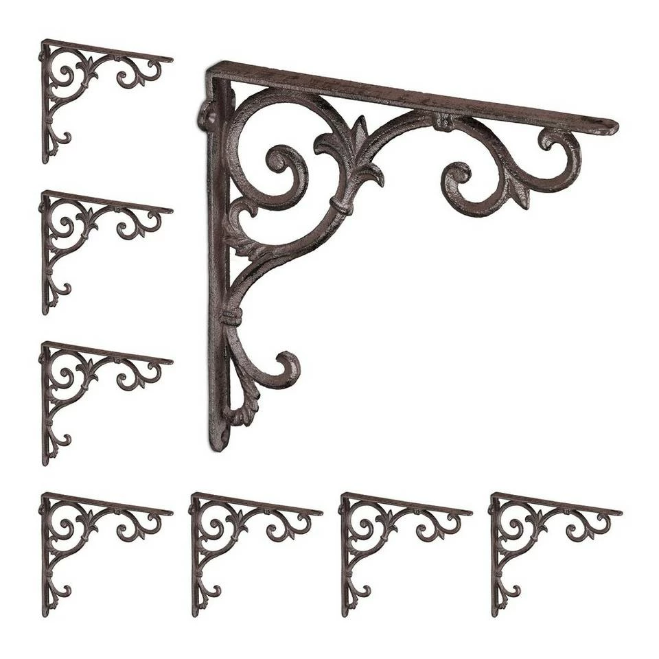 8er Set Regal Wandhalterung mit Ornamenten Mit den Wandwinkeln zaubern Sie aus langweiligen Regalbrettern im Handumdrehen dekorative Wandregale. Die Verzierungen im barocken Stil lassen die Regalstützen zum echten Blickfang werden und versprühen nostalgischen Charme. Komplett aus Gusseisen gefertigt, sind die Wandregalhalterungen besonders stabil und halten Regalböden sicher. Mithilfe vorbereiteter Bohrlöcher können die Regalhalterungen schnell montiert werden.