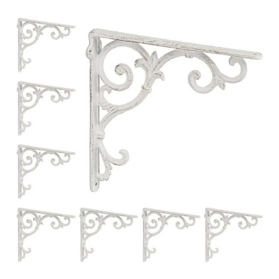 8er Set Regal Wandhalterung mit Ornamenten Mit den Wandwinkeln zaubern Sie aus langweiligen Regalbrettern im Handumdrehen dekorative Wandregale. Die Verzierungen im barocken Stil lassen die Regalstützen zum echten Blickfang werden und versprühen nostalgischen Charme. Komplett aus Gusseisen gefertigt, sind die Wandregalhalterungen besonders stabil und halten Regalböden sicher. Mithilfe vorbereiteter Bohrlöcher können die Regalhalterungen schnell montiert werden.