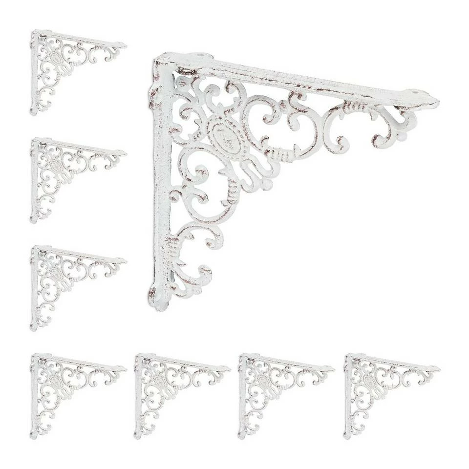 Winkelkonsole für unterschiedliche Regalbretter Die Regal Winkelträger im 8er Set sind praktisch und dekorativ zugleich. Mit einem beliebigen Regalbrett verwandeln Sie die Regalträger in ein einzigartiges und individuelles Wandregal. Gleichzeitig bringen Sie mit der Regalkonsole ganz besonderen Charme in Ihre vier Wände. Setzten Sie antike Akzente im Vintage-Look und nutzen Sie die barocken Ornamente als dekoratives Highlight. Ebenso lassen sich mit den Regalhalterungen auf dem Balkon oder an der Gartenhütte rustikale Akzente setzen.