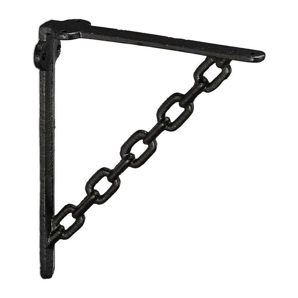 Rustikale Regalträger im nostalgischen Look Schlichten Regalbrettern verleihen Sie mit diesen ausgefallenen Wandwinkeln den letzten Schliff und machen sie zu dekorativen Hängeregalen für Bücher, Dekoartikel und mehr. Die Diagonal-Streben im Ketten-Design verleihen den gusseisernen Regalstützen einen sehenswerten Industrial Look, der durch die Shabby Oberfläche perfekt ergänzt wird. Jede Seite der Regalhalterungen verfügt über 3 Bohrlöcher, sodass Sie die Winkelkonsolen ganz einfach an der Wand und dem Regalboden montieren können.