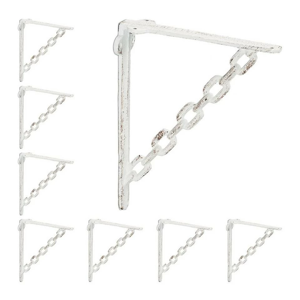 Rustikale Regalträger im nostalgischen Look Schlichten Regalbrettern verleihen Sie mit diesen ausgefallenen Wandwinkeln den letzten Schliff und machen sie zu dekorativen Hängeregalen für Bücher, Dekoartikel und mehr. Die Diagonal-Streben im Ketten-Design verleihen den gusseisernen Regalstützen einen sehenswerten Industrial Look, der durch die Shabby Oberfläche perfekt ergänzt wird. Jede Seite der Regalhalterungen verfügt über 3 Bohrlöcher, sodass Sie die Winkelkonsolen ganz einfach an der Wand und dem Regalboden montieren können.