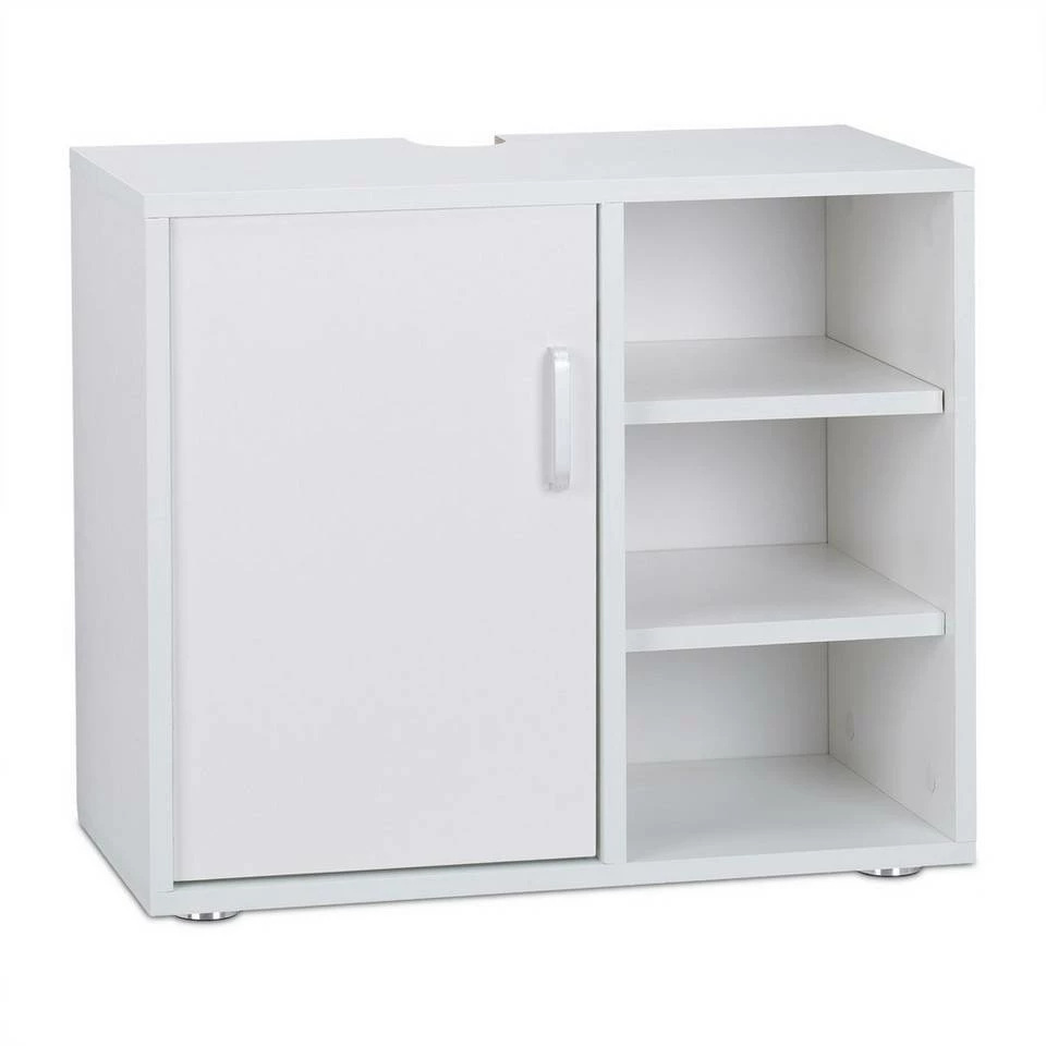 Moderner Waschbeckenunterschrank Mit dem Waschbeckenunterschrank können Sie nicht nur benötigte Putzmittel in dem hohen Türfach unterbringen, sondern auch die offenen Ablagen sinnvoll nutzen. Diese sind perfekt für wichtige Badutensilien wie Handtücher und Klopapier, die griffbereit seien sollten. Durch die 4 Füße ist der Schrank vor kleinen Pfützen geschützt, die öfters mal beim Baden oder Duschen entstehen. Die Aussparung an der Rückseite ist ausreichend für gängige Siphons. Bei besonders tiefen Siphons können Sie auch die kleine Rückwand-Platte weglassen. Der Badschrank kommt in modernen Farben.