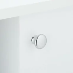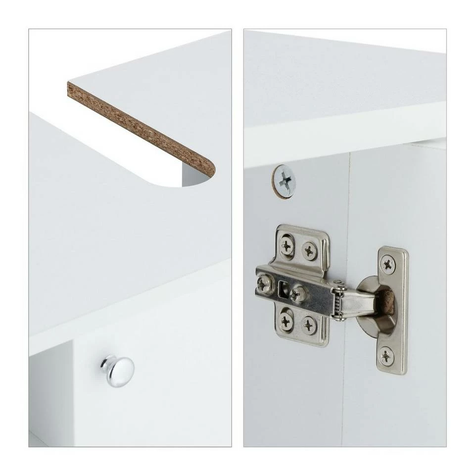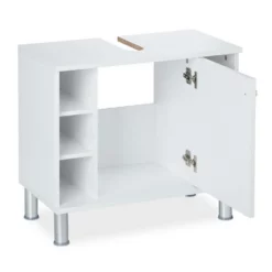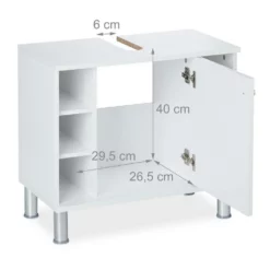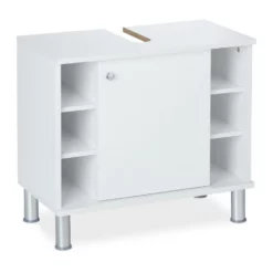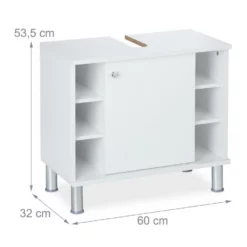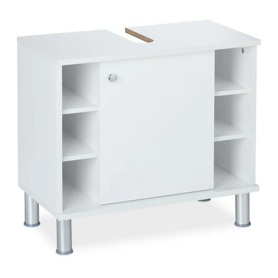 Badschrank für unter das Waschbecken Nutzen Sie den Stauraum unter Ihrem Waschbecken mit dem Unterschrank ideal aus. In dem geschlossenen Schrankfach lagern Sie Handtücher, den Duschgel-Vorrat oder Reinigungsmittel. Die kleinen offenen Fächer an den Seiten eignen sich bestens, um Kosmetik, Cremes, Wattepads und mehr übersichtlich zu verstauen und immer griffbereit zu haben. Das dezente Design in Weiß fügt sich auch in Ihr Badezimmer ein und der kleine silberne Knauf sorgt daneben für einen optischen Akzent.