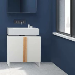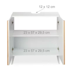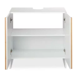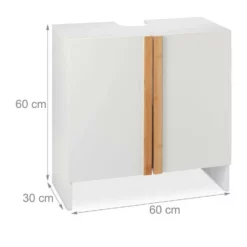 Weißer Badezimmerschrank für das Waschbecken Insbesondere in kleinen Bädern ist der Platz häufig begrenzt. Mit diesem Badezimmerunterschrank verwandeln Sie den Raum unter dem Waschbecken in wertvollen Stauraum für Toilettenpapier, Putzmittel, Fön und Handtücher. Der schlichte Look des Waschbeckenunterschranks fügt sich in jedes Badezimmer gut ein. Die stilvollen Bambus-Akzente lockern das ansonsten in Weiß gehaltene Design des Badschranks auf und machen ihn zu einem optischen Highlight in Ihrem Bad.