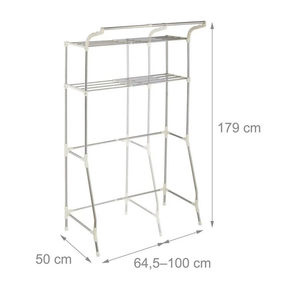 Platzsparendes Badregal für Waschmaschine & Trockner Dieses praktische Badezimmerregal bietet mit seinen 2 Ablagen Platz zur Aufbewahrung von Waschmitteln oder Toilettenartikeln. An der Hakenleiste können Lappen und Handtücher aufgehängt werden. Sonst ungenutzter Raum über der Waschmaschine oder dem Trockner verwandelt sich mit dem cleveren Waschmaschinenüberbau in großzügigen Lagerplatz. Das Überbauregal kann bei Bedarf in der Breite ausgezogen werden und lässt sich somit perfekt an die Gerätegröße sowie die räumlichen Gegebenheiten anpassen.