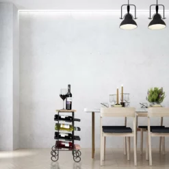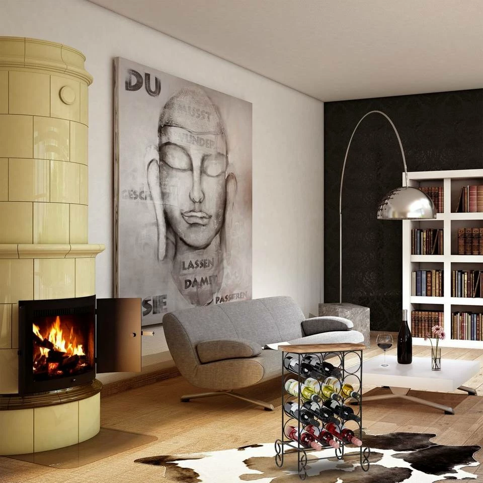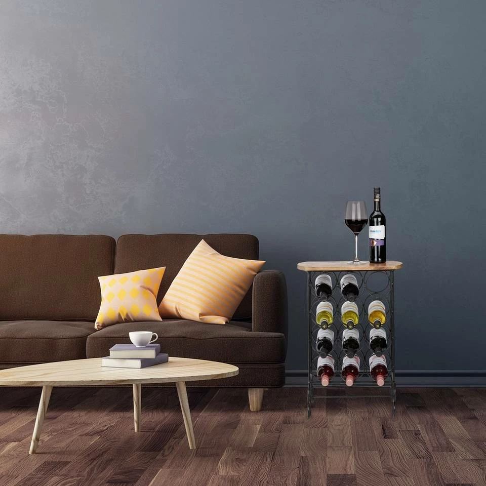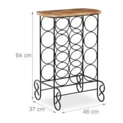 Design Weinregal für 12 Flaschen Dieser Flaschenhalter bietet Platz für 12 edle Tropfen. Die einzelnen Weine liegen waagerecht in den ringförmigen Halterungen. Die Korken bleiben dabei feucht und der Wein luftdicht verschlossen. Besonderes Highlight sind die Tischplatte aus natürlich gemasertem Mangoholz und den geschwungenen Metallfüßen des Weinregals. Diese Kombination verleiht der Weinaufbewahrung ihre edle Ausstrahlung, wodurch sie sich toll als Deko-Element in Wohnzimmer oder Hausbar einfügt.