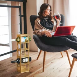 Weinregal für 5 edle Tropfen Mit diesem Weinregal aus edlem Bambus holen Sie sich die optimale Lagermöglichkeit für Ihren Lieblingswein nach Hause. Die waagerechte Aufbewahrung verhindert das Austrocknen der Korken. Der Wein bleibt fest verschlossen. Sie können mehrere dieser Regale problemlos waagerecht übereinander stapeln. So schaffen Sie Stauraum für zahlreiche weitere Flaschen. Die moderne und dennoch dezente Optik lässt den Flaschenhalter überall gut platziert erscheinen.